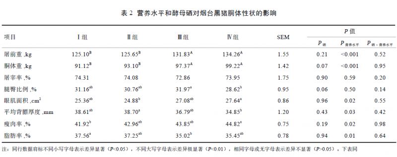 2.1 营养水平和酵母硒对烟台黑猪胴体性能的影响