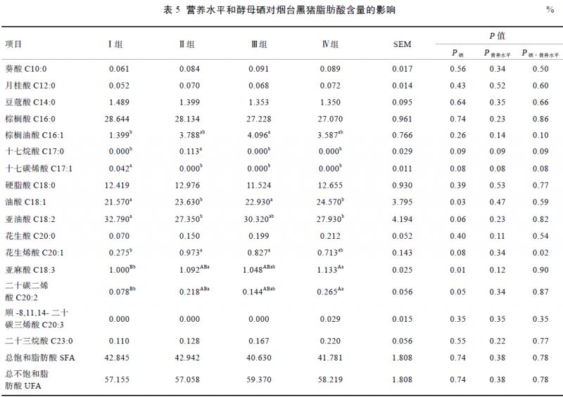 2.4 营养水平和酵母硒对烟台黑猪肌肉脂肪酸含量的影响