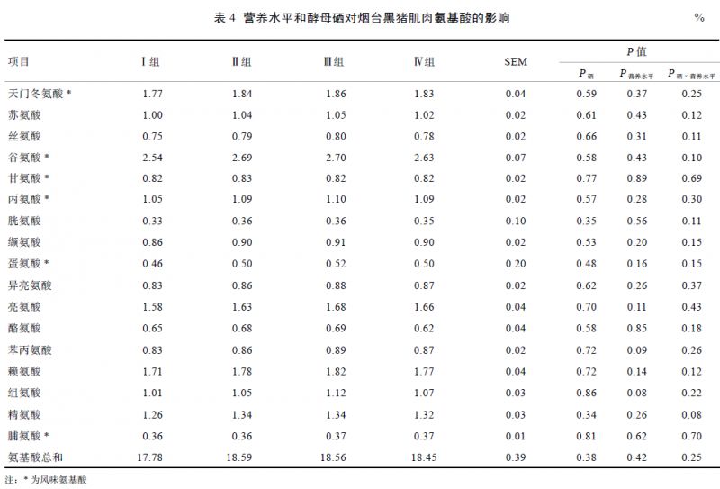 彭英林研究表明,不同营养水平对杜洛克、杜× 长× 大、大× 围、围子猪肌肉中氨基酸含量的影响效应总体不显著。在本试验中,高营养水平能提高谷氨酸、甘氨酸、天门冬氨酸、丙氨酸、蛋氨酸、脯氨酸等风味氨基酸的含量;营养水平和酵母硒对烟台黑猪肌肉必需氨基酸影响不显著,且营养水平和酵母硒之间也无互作效应。