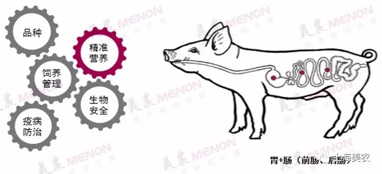 美农“替抗”策略的思路是:系统思考、重点突破!即先结合动物的生理特点,立足于饲料本身,以精准营养的思路做好饲料(营养水平、原料选择、加工工艺等),同时关注动物的消化道健康,尤其是肠道健康。在肠道健康方面,则需要通过合理使用添加剂产品,保证肠道结构完整、屏障功能正常。