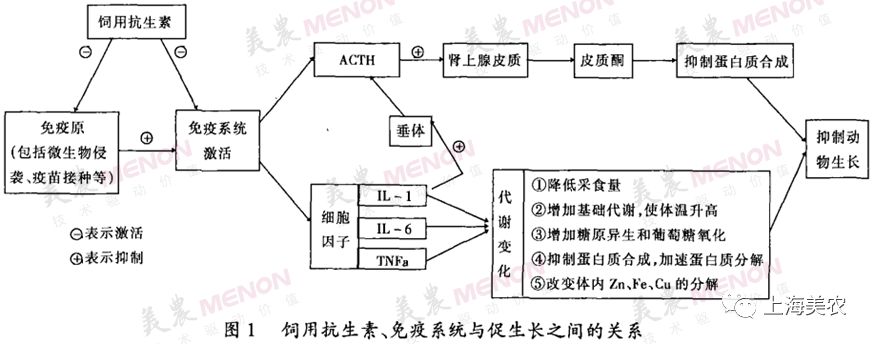 动物机体在免疫反应过程中会降低动物的采食量,增加机体的维持需要,并加快机体蛋白质的降解,导致动物饲料利用率降低,从而使动物的生长受到抑制。众多研究表明,饲用抗生素多数具有免疫抑制作用。虽然其免疫调节的具体机制目前还不甚清楚,但饲用抗生素整体上是通过直接 (直接影响免疫系统的反应能力) 或间接(通过降低微生物侵袭强度 )影响免疫系统,防止免疫系统激活,从而促进动物生长(如下图)。