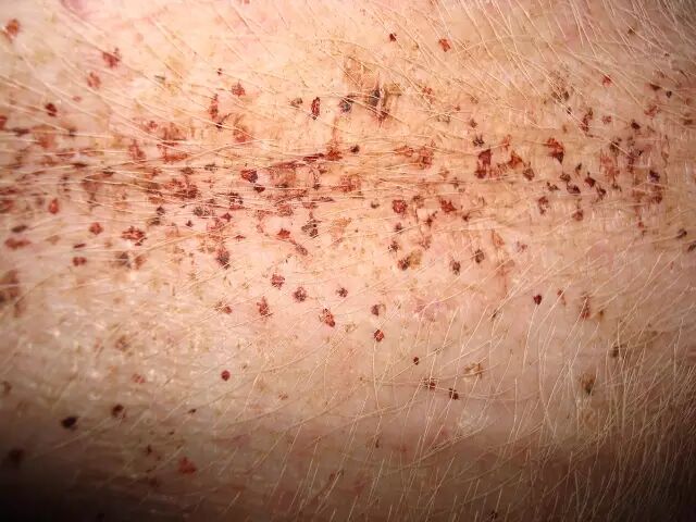 ⑤耳翼、鼻端、下肢、股内侧、下腹等处出现紫红斑或小点出血。耳朵上形成痂皮,耳尖发生干性坏死。
