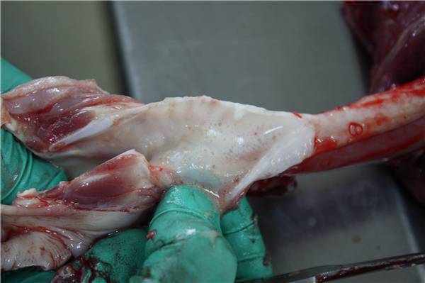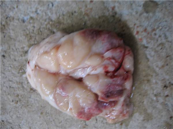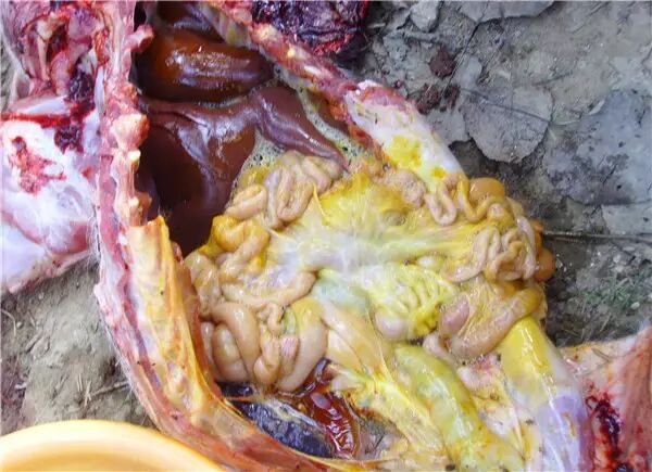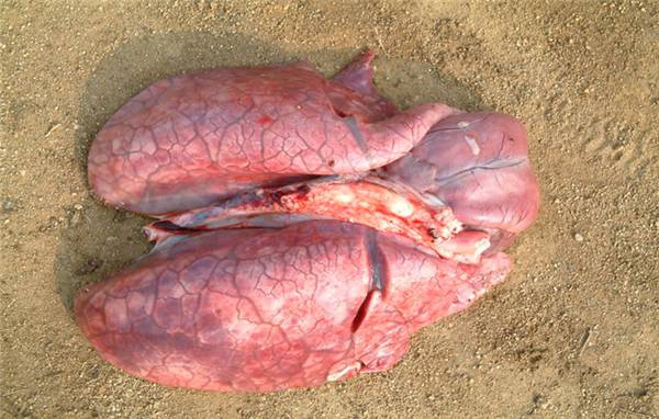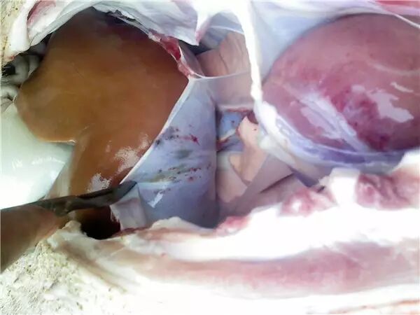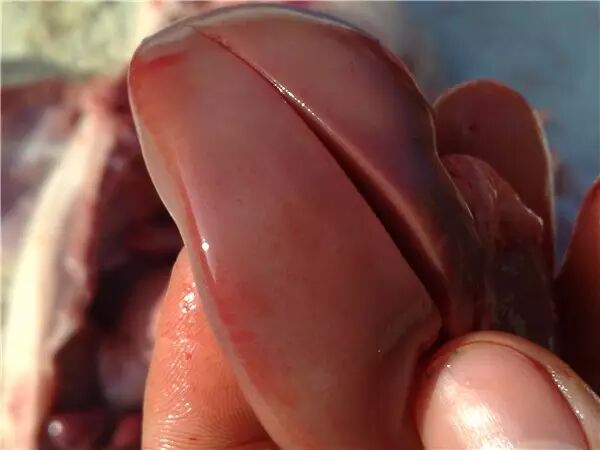 ②心肝脾肺肾脏肿大,全身淋巴结肿大,摸起来柔软,切开灰白色坏死。