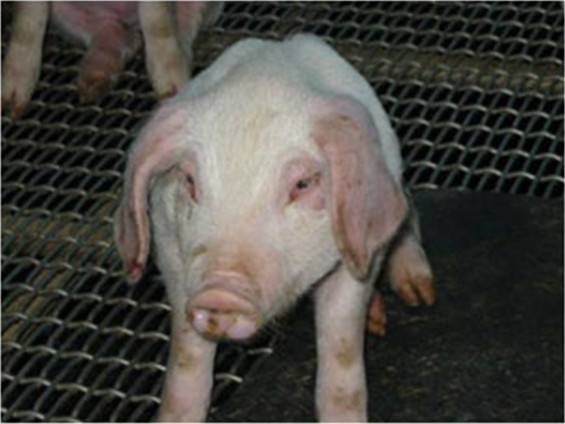 ④胸腹和耳后发红,耳尖紫色,严重的猪出现呼吸困难、咳嗽、走路不稳