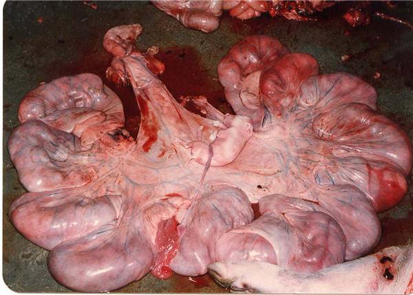 ①母猪怀孕期间经胎盘感染胎儿,易发生流产、死胎。
