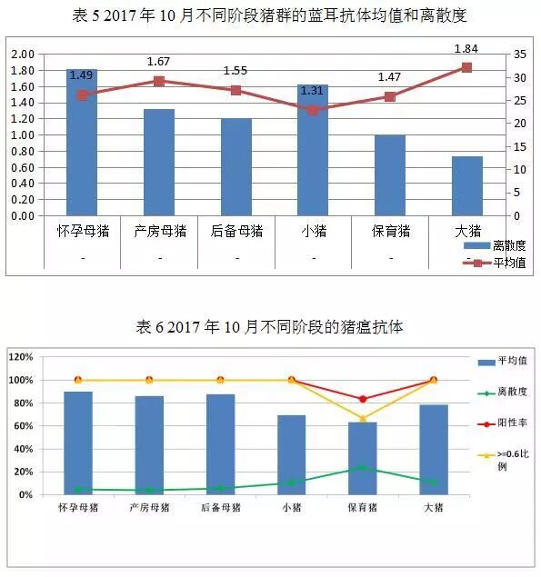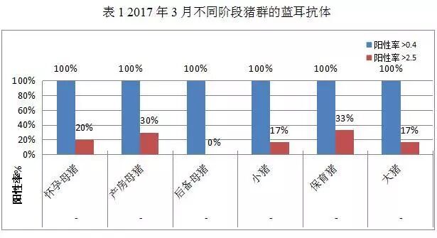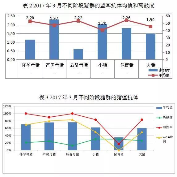 背景 广东某猪场,母猪规模600头左右。从2014年投产开始一直使用江西株蓝耳疫苗,母猪1年3次,仔猪14日龄免疫1次,猪场的生产成绩还算稳定。自从2016年底引入后备母猪以来,猪场整体的生长状态开始出现不稳定的情况,主要表现为母猪发情不正常,母猪返情比例增加,母猪死胎和木乃伊的比例增加等繁殖障碍症状。断奶后7-20日龄的仔猪出现发烧、毛松消瘦,喘气、关节肿大的比例增加,死淘率达到20%以上。使用各种药物都没有达到好的效果。 临床剖检和实验室检测分析 2017年3月,根据猪场的信息反馈和现场的了解,我们对全场不同阶段的猪群进行采血检测,并对正在发病的猪进行剖检、取样做病原分析。 剖检结果发现:全身淋巴结肿大、出血;间质性肺炎;后肢关节肿大,切开后为脓性分泌物。血清和病原检测结果见表1、2、3和图1。由表可见,蓝耳抗体最主要的问题集中在产房和保育舍,蓝耳抗体阳性率高,但是离散度较大,且S/P值大于2.5的比例较高。病原检测和测序结果显示,猪场蓝耳病原为GM2类变异毒株。另一方面,从表3可以看到,由于受到蓝耳的影响,猪场不同阶段的猪瘟抗体水平也较差,抗体合格率偏低。结合猪场的生产情况和实验室检测结果,判定猪场为蓝耳活跃场。 解决方案 针对场内的发病情况,我们制定了个性化的防控方案。方案为: 1、新生仔猪出生24小时内肌注0.5头份(GDr180),10日龄肌注1头份(GDr180); 2、全场母猪药物保健一周后,不同阶段的母猪小范围试用,肌注1头份,观察7天。无不良反应,全群普免1头份,一个月后加强免疫1头份,随后3次/年。 使用效果和方案改进 母猪和仔猪使用疫苗后均取得了较为显著的效果。但是,据场长反映,保育舍仍是有较大比例的发热情况,死淘率较高(10%左右)。针对猪场的情况,我们再次进入生产区发现,保育舍的通风降温效果极差,舍内温度最高时可达35度以上(正值广东炎热的夏季),而且由于栏舍不足,猪群饲养密度过大。 针对所发现的问题,我们建议必须改善保育舍的通风降温效果(如安装风机和水帘),另外减低饲养密度,改善保育猪的饲养环境。 跟踪回访 2017年10月,我们再次给猪场提供血清检测服务。从检测报告来看(见表4、5和6),经过半年来GDr180蓝耳疫苗的使用,以及猪场生产管理和硬件设施的改善。猪群整体的蓝耳抗体水平都有了明显的改善。更重要的是,猪场的生产状况得到了较大的提升。另外,从表6可以看到,在没有变动猪瘟疫苗及其免疫程序的情况下,猪群整体的猪瘟抗体水平与半年前相比也有了明显的提升,猪瘟抗体的合格率基本达到90%以上。由此可见,当猪场出现蓝耳不稳定的时候,往往会对猪瘟疫苗的免疫效果造成较大的影响,严重时甚至会表现出一些猪瘟发病的症状。 GDr180免疫半年后保育猪长势良好,发病猪明显减少 小 结 众所周知,猪蓝耳病(PRRS)是免疫抑制性疾病,不仅会严重影响猪的生长性能,而且还会影响其他疫苗(如猪瘟)的免疫效果,而从这个猪场的蓝耳使用经验来看,要想蓝耳疫苗达到我们预期的效果,必须充分了解猪场的整体情况,选用安全高效的蓝耳疫苗(GDr180),制定合理的免疫程序,还要给猪场提供改善生产管理和生物安全等全面综合的防控方案。