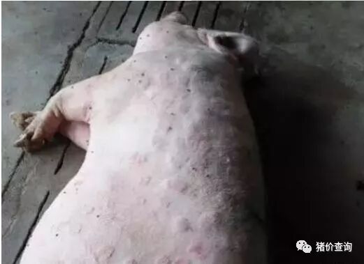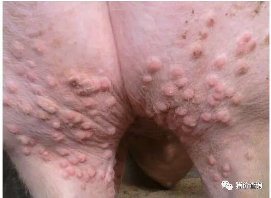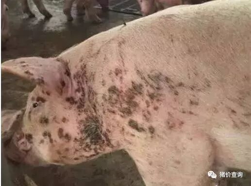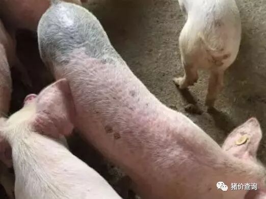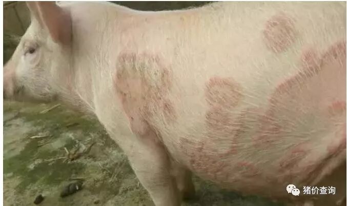 急性患猪,大多发病突然,病初猪的颌下、腹部和会阴两侧皮肤发红,同时出现蚕豆大的结节,并瘙痒不安,以后随着病情加重患猪皮肤出现水泡、丘疹,破裂后常伴有黄色渗出液,最后结痂或转化成鳞屑等。