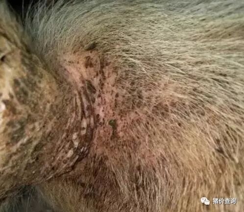 该病俗称猪癞、疥疮,是猪皮肤病中最普遍和最严重的一种,严重的疥癣不但影响猪体增重,还可造成猪的应激反应。患猪剧痒,磨蹭,用肢蹄搔弄患部,常致出血、脱毛、结痂,并常在猪眼周、颊部、耳根、背部、体侧和股内侧皮肤肥厚处,形成皱褶和龟裂。