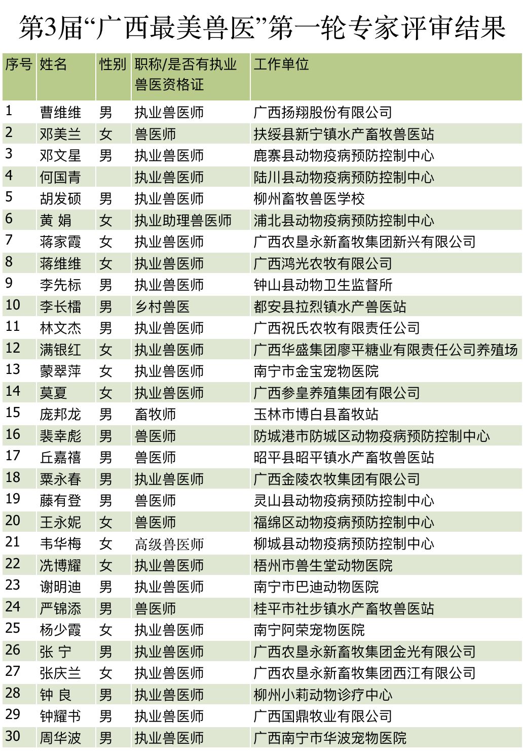 这30位兽医代表,从广西兽医协会组织的“第三届广西最美兽医”首轮专业评审团的评选中脱颖而出,将作为广西兽医代表参与6月16-20日的网络评选以及6月23日的专家评审团和往届最美兽医评审团的评选,最终获奖者将获得由广西兽医协会颁发的“第三届广西最美兽医”荣誉证书和奖金3000元。