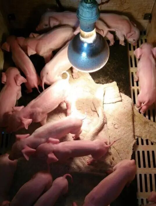 当使用250瓦灯泡,高度低于45厘米时,灯下的温度太高,仔猪会不适应。灯的高度高于45厘米时,起不到多大作用。要将灯泡挂在距地面45厘米处,使环境温度达到34℃。