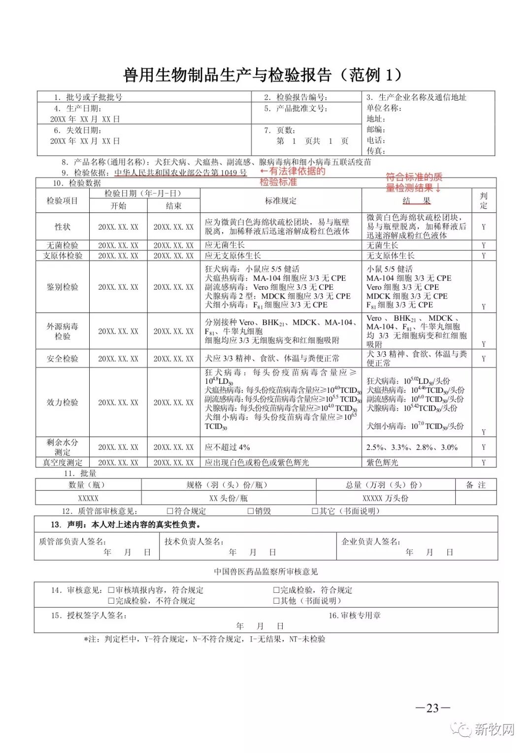 中国兽医药品监察所在2010年发布了《兽用生物制品批签发管理程序》,规定每一批次疫苗在出厂之前需要获得中监所批签发,而中监所在签发疫苗批签发时,会要求企业提交该批次疫苗的《兽用生物制品生产与检验报告》,该报告即是判断该批次产品是否合格的依据。 中监所负责对企业提交的包括《兽用生物制品生产与检验报告》在内的批签发资料进行审核。审核《兽用生物制品生产与检验报告》中“检验采用的质量标准是否有法定依据”,“检验项目、方法和结果是否符合质量标准规定”。 其中采用的质量标准应为兽药国家质量标准,包括《中华人民共和国兽药典》、《中华人民共和国兽用生物制品规程》和农业部颁布的其它质量标准;进口兽用生物制品的审核依据为农业部颁布的注册产品质量标准。【范例1】