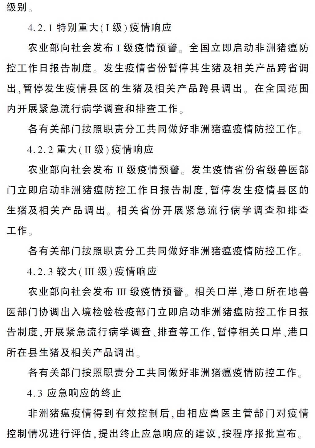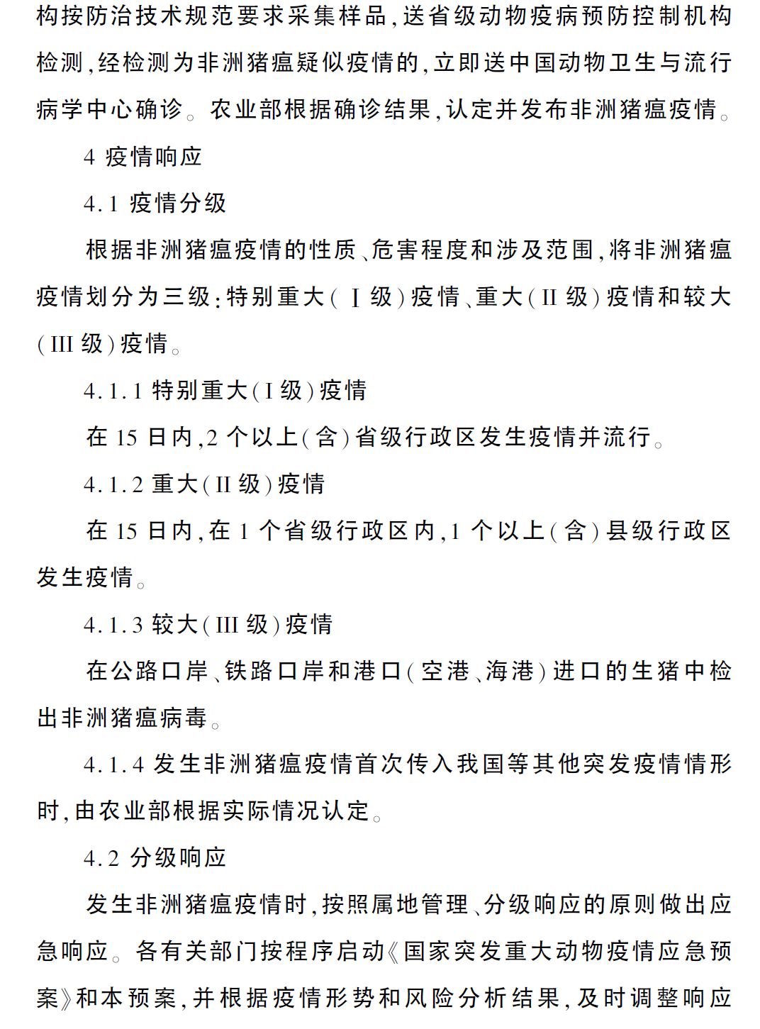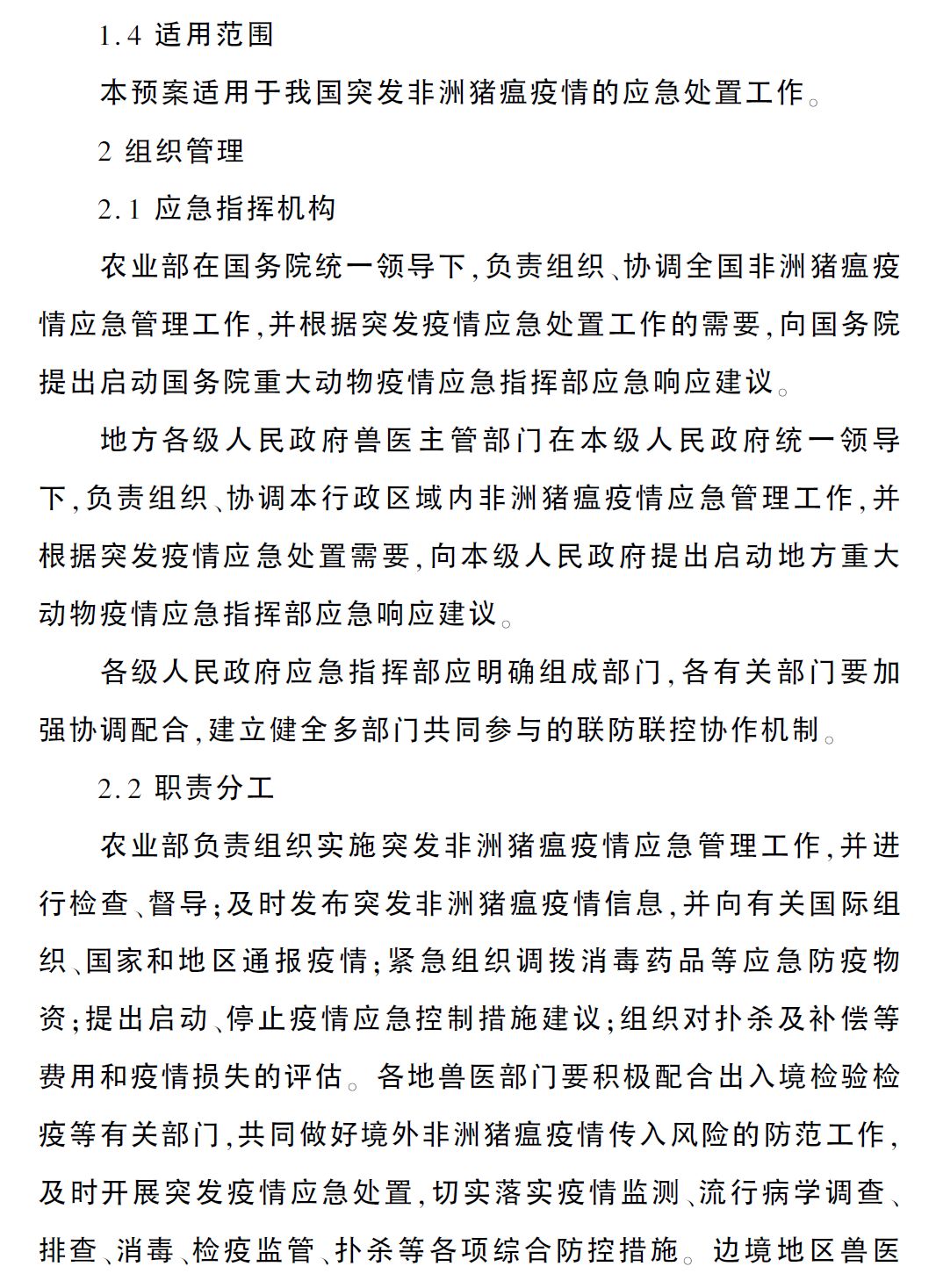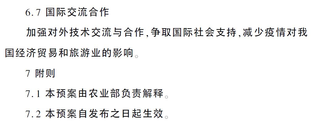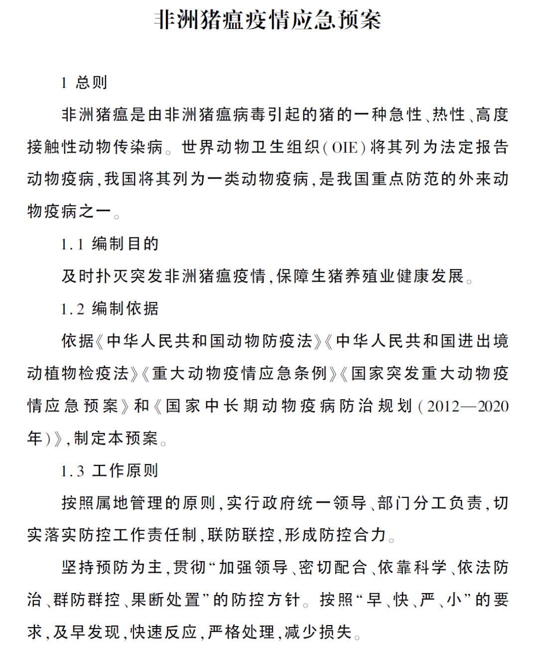 为贯彻落实《国家中长期动物疫病防治规划(2012—2020年)》,切实做好非洲猪瘟疫情应急处置工作,根据《中华人民共和国动物防疫法》等法律法规,农业农村部组织制定了《非洲猪瘟疫情应急预案》。
