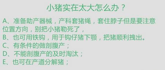 解析:没办法,这就需要我们助产器械的准备,产科套猪绳,一般过大的仔猪可以套住脖子,为了是防止把鼻子拉断,但是要注意位置方向,别把小猪勒死了,还有铁钩,用于钩仔猪下颚,放心操作,一般都能自己恢复。有条件的还有做剖腹产;