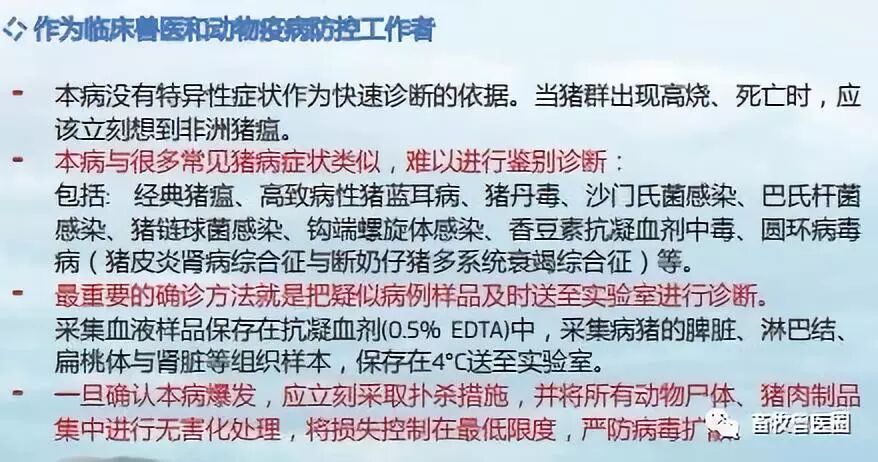 要督促养殖场(户)和生猪屠宰企业落实主体责任,按规定申报检疫,在装载前、卸载后对运输车辆进行彻底清洗、消毒。要严格按程序和规程要求开展检疫工作,不得受理高风险区内调出的生猪和未经高温处理的生猪产品检疫申报。要强化对调运生猪的临床健康检查和屠宰生猪的待宰、宰后检疫,重点检查疑似非洲猪瘟临床症状,脾脏、淋巴结等典型病理变化,发现疑似非洲猪瘟症状和病变,要立即采取控制措施并及时报告。