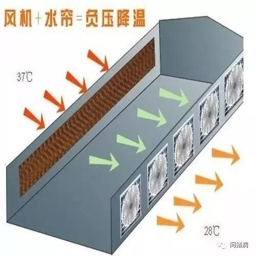 对封闭式猪舍,通风和蒸发是最主要的降温措施,通风可有效降低空气湿度,带走舍内热量,蒸发是最有效的降温方法,常用的蒸发降温系统有:湿帘 -风机降温系统、喷雾降温系统、喷淋降温系统和滴水降温系统。