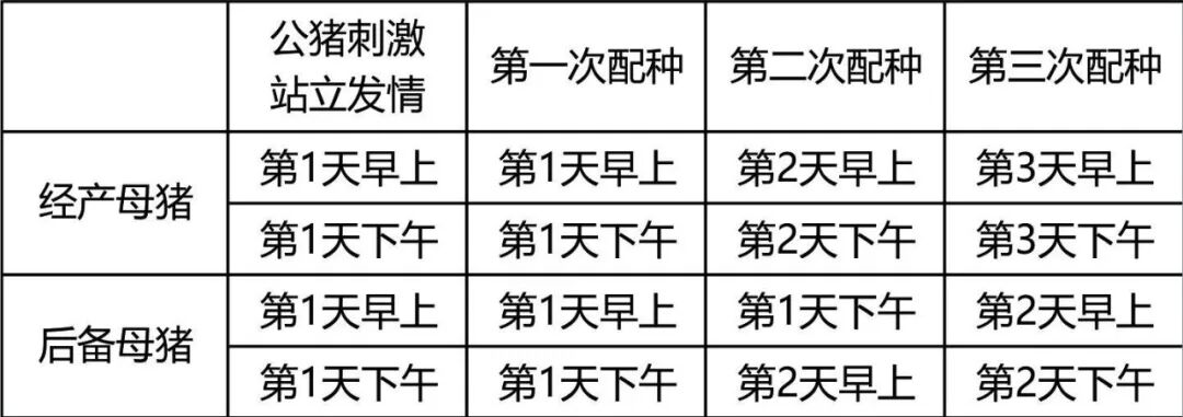 从实用观点出发,如果配种员每天保证2次高质量的查情,在发现第1次静立反射发情后0~12小时做第1次输精,然后只要母猪仍有静立反射,每间隔24小时输精,共2~3次就足够了。但是要通过此人工授精获得更好的效果,建议每隔12小时对返情母猪和全部后备母猪授精一次。
