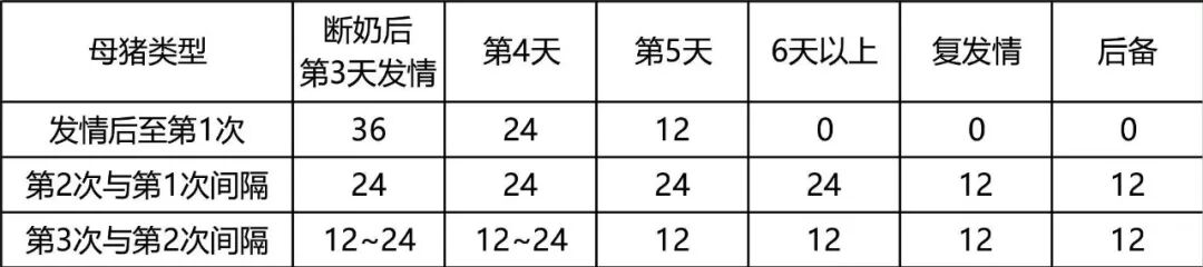 各类母猪最适配时间及间隔具体见表(小时)