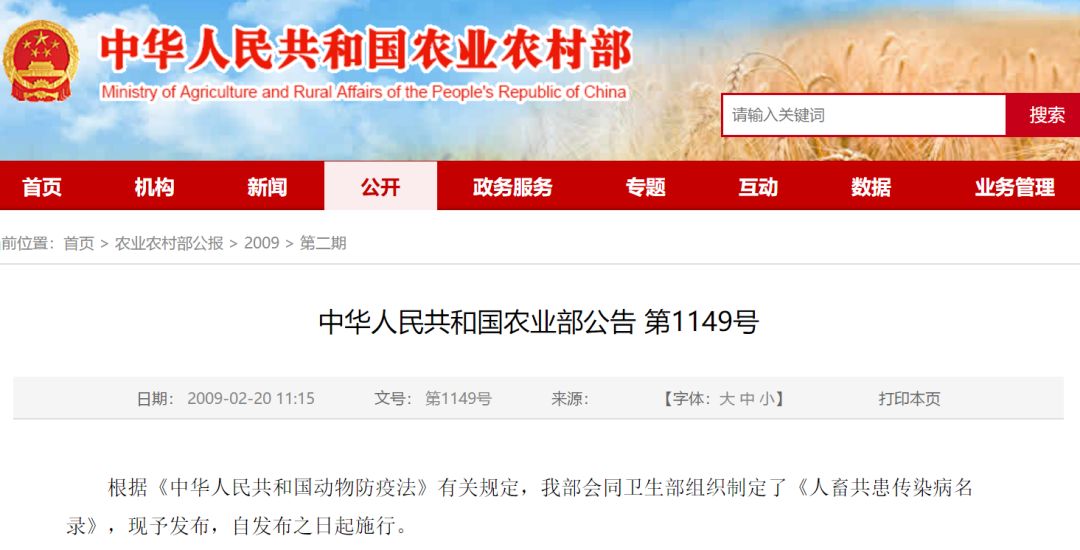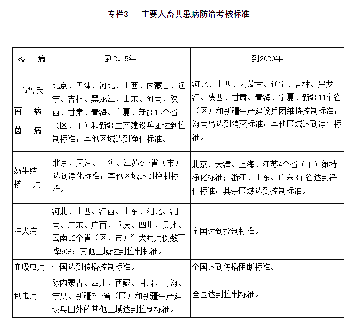 世界卫生组织定义的人兽共患病是指那些可在非人类脊椎动物和人类之间传播的感染性疾病,其传播可以不再依赖动物宿主。 人兽共患病和人畜共患病 其实,人畜共患病(zoonosis)是一种传统的提法,但是上世纪70 年代以来,全球范围新出现传染病(emerging infectious diseases,EID)和重新出现传染病(re-emerging infectious diseases,R-EID)达到60 多种,其中半数以上是人兽共患病,即不仅仅是人类与其饲养的畜禽之间存在共患疾病,而且与野生脊椎动物之间也存在不少共患疾病,后者甚至在猛恶程度上甚于前者。 因为下文主要是提及人类与畜禽之间的共患疾病,未涉及到人类与野生脊椎物动之间的共患疾病,所以称为人畜共患病。 早在2009年,我国便发布中华人民共和国农业部公告第1125号,公布了26种常见的人畜共患病名录。 具体名单如下 牛海绵状脑病 高致病性禽流感 狂犬病 炭疽 布鲁氏菌病 弓形虫病 棘球蚴病(包虫病) 钩端螺旋体病 沙门氏菌病 牛结核病 日本血吸虫病 猪乙型脑炎 猪Ⅱ型链球菌病 旋毛虫病 猪囊尾蚴病 马鼻疽 野兔热 大肠杆菌病(O157:H7) 李氏杆菌病 类鼻疽 放线菌病 肝片吸虫病 丝虫病 Q热 禽结核病 利什曼病 在2012年印发的《国家中长期动物疫病防治规划(2012—2020年)》中划分出人畜共患病重点流行区,明确了主要人畜共患病防治考核标准。 人畜共患病重点流行区 对北京、天津、河北、山西、内蒙古、辽宁、吉林、黑龙江、山东、河南、陕西、甘肃、青海、宁夏、新疆15个省(区、市)和新疆生产建设兵团,重点加强布鲁氏菌病防治。 对河北、山西、江西、山东、湖北、湖南、广东、广西、重庆、四川、贵州、云南12个省(区、市),重点加强狂犬病防治。 对江苏、安徽、江西、湖北、湖南、四川、云南7个省,重点加强血吸虫病防治。 对内蒙古、四川、西藏、甘肃、青海、宁夏、新疆7个省(区)和新疆生产建设兵团,重点加强包虫病防治。 人畜共患病防治考核标准