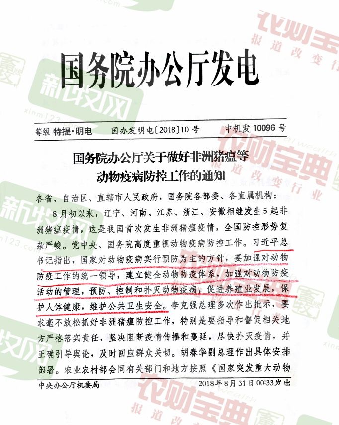 8月30日,国务院办公厅印发《关于做好非洲猪瘟等动物疫病防控工作的通知》(以下简称“通知”)。