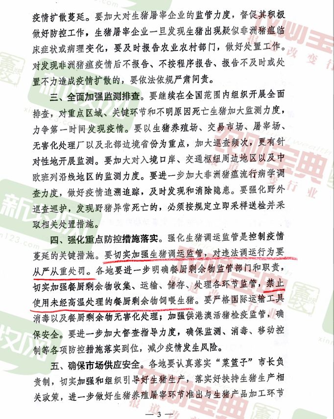 在重点防控措施落实方面。通知指出,相关部门要切实加强生猪调运管理,对违法调运行为要从严从重处罚。同时各地要进一步明确餐厨剩余物监管部门和职责,切实加强餐厨剩余物收集、运输、储存、处理各环节监管,禁止使用使用未经高温处理的餐厨剩余物饲喂生猪。