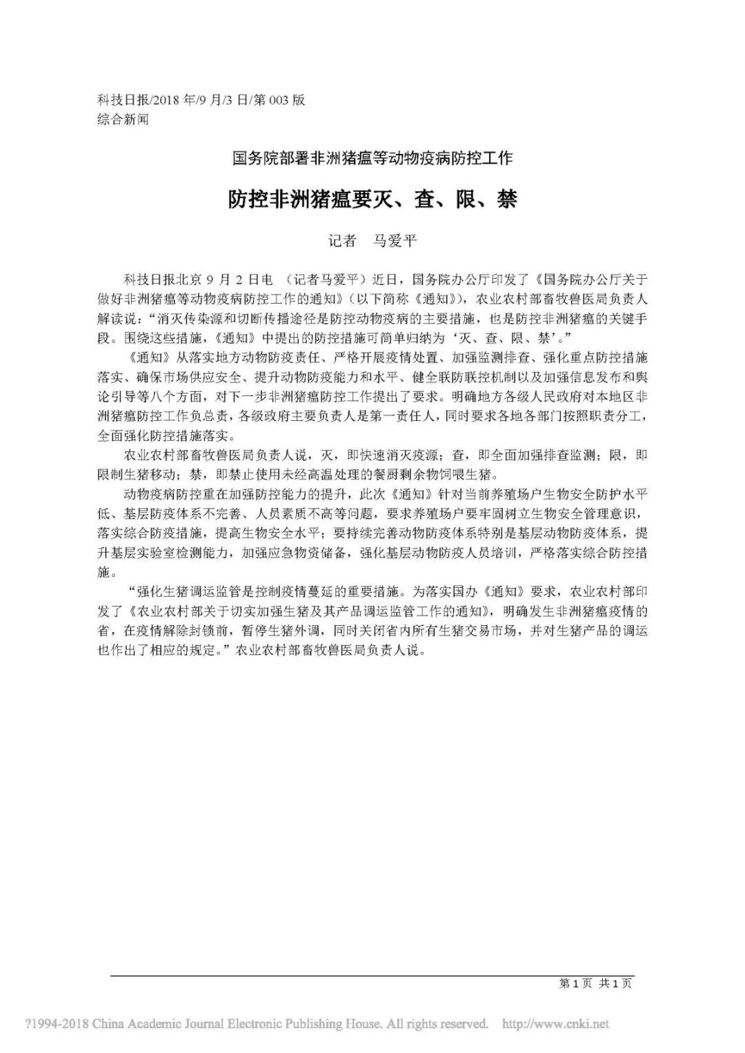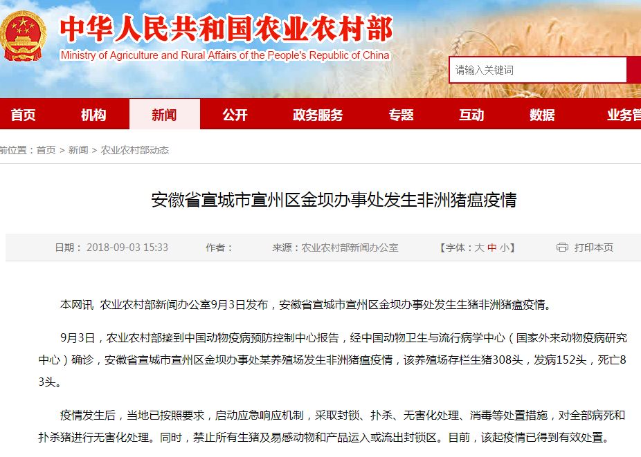 农业农村部新闻办公室9月3日发布,安徽省宣城市宣州区金坝办事处发生生猪非洲猪瘟疫情。截至今日,安徽省已有2市4地发生非洲猪瘟疫情。 农业农村部新闻办公室9月3日发布,安徽省宣城市宣州区金坝办事处发生生猪非洲猪瘟疫情。 9月3日,农业农村部接到中国动物疫病预防控制中心报告,经中国动物卫生与流行病学中心(国家外来动物疫病研究中心)确诊,安徽省宣城市宣州区金坝办事处某养殖场发生非洲猪瘟疫情,该养殖场存栏生猪308头,发病152头,死亡83头。 疫情发生后,当地已按照要求,启动应急响应机制,采取封锁、扑杀、无害化处理、消毒等处置措施,对全部病死和扑杀猪进行无害化处理。同时,禁止所有生猪及易感动物和产品运入或流出封锁区。目前,该起疫情已得到有效处置。 从8月30日至9月3日,短短5日,安徽省已有2市4地发生非洲猪瘟疫情,其中,宣城市宣州区古泉镇、五星乡、金坝办事处分别发生一起非洲猪瘟疫情。 安徽省芜湖市南陵县 8月29日,安徽省畜牧兽医部门在开展非洲猪瘟疫情排查时,发现芜湖市南陵县某养殖场生猪不明原因死亡。8月30日,经中国动物卫生与流行病学中心(国家外来动物疫病研究中心)确诊为非洲猪瘟疫情。该场共存栏生猪459头,截至目前,发病185头,死亡80头。 宣城市宣州区古泉镇 9月2日,农业农村部接到中国动物疫病预防控制中心报告,经中国动物卫生与流行病学中心(国家外来动物疫病研究中心)确诊,安徽省宣城市宣州区古泉镇发生非洲猪瘟疫情。古泉镇某养殖场存栏生猪285头,死亡40头。 宣城市宣州区五星乡 9月2日,农业农村部接到中国动物疫病预防控制中心报告,经中国动物卫生与流行病学中心(国家外来动物疫病研究中心)确诊,安徽省宣城市宣州区五星乡发生非洲猪瘟疫情。五星乡某养殖场存栏生猪440头,死亡94头。 宣城市宣州区金坝办事处 9月3日,农业农村部接到中国动物疫病预防控制中心报告,经中国动物卫生与流行病学中心(国家外来动物疫病研究中心)确诊,安徽省宣城市宣州区金坝办事处某养殖场发生非洲猪瘟疫情,该养殖场存栏生猪308头,发病152头,死亡83头。 鉴于当前全国非洲猪瘟防控形势十分复杂严峻,近日,国务院办公厅专门印发了《国务院办公厅关于做好非洲猪瘟等动物疫病防控工作的通知》,对我国非洲猪瘟等动物疫病防控工作做出全面部署。《通知》指出,党中央、国务院高度重视动物疫病防控工作,中央领导同志对此作出重要指示。 防控非洲猪瘟要灭、查、限、禁 (记者马爱平) 近日,国务院办公厅印发了《国务院办公厅关于做好非洲猪瘟等动物疫病防控工作的通知》(以下简称《通知》),农业农村部畜牧兽医局负责人解读说:“消灭传染源和切断传播途径是防控动物疫病的主要措施,也是防控非洲猪瘟的关键手段。围绕这些措施,《通知》中提出的防控措施可简单归纳为‘灭、查、限、禁’。” 《通知》从落实地方动物防疫责任、严格开展疫情处置、加强监测排查、强化重点防控措施落实、确保市场供应安全、提升动物防疫能力和水平、健全联防联控机制以及加强信息发布和舆论引导等八个方面,对下一步非洲猪瘟防控工作提出了要求。明确地方各级人民政府对本地区非洲猪瘟防控工作负总责,各级政府主要负责人是第一责任人,同时要求各地各部门按照职责分工,全面强化防控措施落实。 农业农村部畜牧兽医局负责人说,灭,即快速消灭疫源;查,即全面加强排查监测;限,即限制生猪移动;禁,即禁止使用未经高温处理的餐厨剩余物饲喂生猪。 动物疫病防控重在加强防控能力的提升,此次《通知》针对当前养殖场户生物安全防护水平低、基层防疫体系不完善、人员素质不高等问题,要求养殖场户要牢固树立生物安全管理意识,落实综合防疫措施,提高生物安全水平;要持续完善动物防疫体系特别是基层动物防疫体系,提升基层实验室检测能力,加强应急物资储备,强化基层动物防疫人员培训,严格落实综合防控措施。 “强化生猪调运监管是控制疫情蔓延的重要措施。为落实国办《通知》要求,农业农村部印发了《农业农村部关于切实加强生猪及其产品调运监管工作的通知》,明确发生非洲猪瘟疫情的省,在疫情解除封锁前,暂停生猪外调,同时关闭省内所有生猪交易市场,并对生猪产品的调运也作出了相应的规定。”农业农村部畜牧兽医局负责人说。