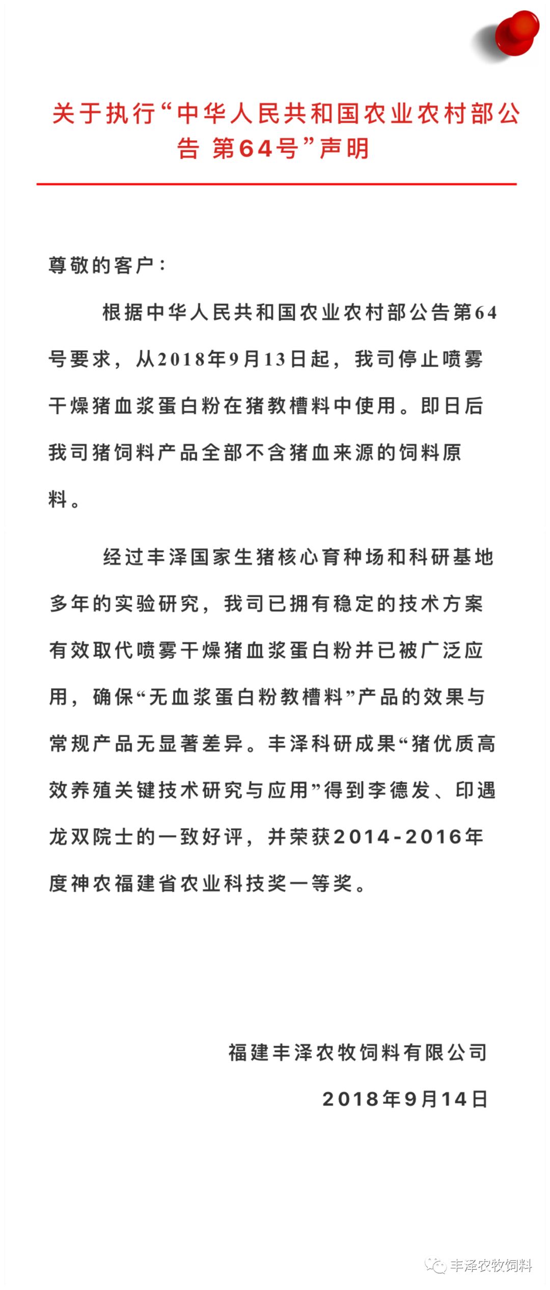 丰泽农牧:关于执行“中华人民共和国农业农村部公告 第64号”声明