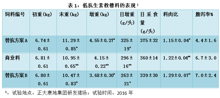 表1展示了我们在教槽饲料践行“营养免疫 正大康地”的试验结果,从表中可以发现替抗方案A从采食量、增重、料肉比和腹泻控制方面都获得了良好的试验结果。