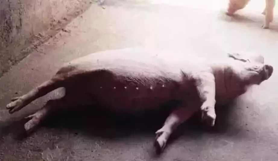 最后嘶叫一声倒地而死亡(有个别死前天然孔流出暗红色血液)、呼吸困难(个别张口呼吸),呼出气带有嗅味。废食、厌饮水。体温39.5℃——41℃左右,以40.3℃——40.7℃常见,在衰竭期往往在腹下、四肢下端、颈及耳呈紫红色或出血性红斑。