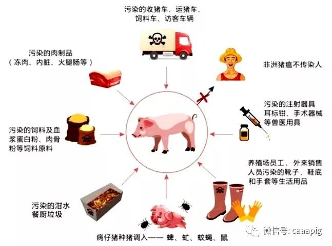 国内已查明疫源的68起疫情,主要有3种传播途径,分别为生猪异地调运(占疫情约19%)、餐厨垃圾喂猪(占疫情约34%)、生猪调运车辆及贩运人员携带病毒(占疫情约46%)。
