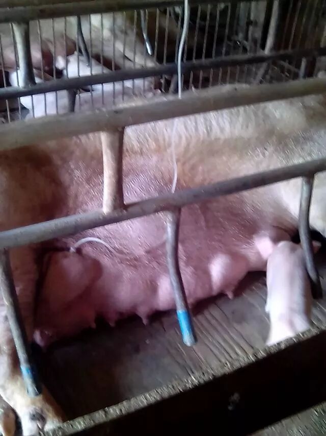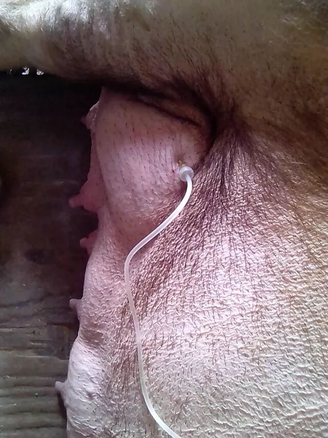 3、趁猪喂奶或侧卧时,左手捏起消毒部位皮肤,右手将注射针头全部插入,打开注射器开关即可。