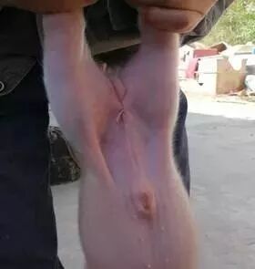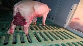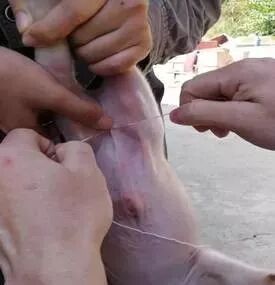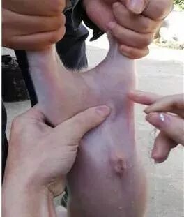 作者苏焱深常年服务于各大猪场一线,一些猪场都会有自己的小操作技巧,今天要跟大家分享的就是一种简易操作的漏肠手术方法。 治疗原则:手术方法最好在5-7天左右进行,阴囊漏肠部分比较明显先手术结扎后阉割,漏肠部分出来不是很明显可以先阉割再手术结扎。 具体操作步骤: 第一步:副手把漏肠小猪倒立保定。 第二步:用手轻轻把漏肠送回腹腔,然后用左手拇指按压住腹股沟管处。 第三步:右手持穿好缝线的半弯针,从最后一对奶头偏右侧进针2厘米,同样对称再穿过左侧。(注意:进针时要稍微带一些肌肉,也不要带得过深) 第四步、在皮肤外拉紧缝线,腹股沟管呈烟包式缝合状。(注意:打结时让副手按住腹股沟部位,防止肠子从腹腔漏出) 最后结扎好摸一下睾丸处是否有肠子,再把小猪以站立放正,看看是否还漏,剪断缝线消毒,再进行去势(注意:去势时不要过度用力拉扯睾丸和精索,可以直接用手术刀剥离掉),5-7天后解开缝合线更佳。 小结:该方法成功关键:位置要准、进针要狠、缝线要紧。 阉割后发现漏肠进行手术: 该方法操作简单,效果明显,与常用切割手术疗法比较有许多优势。 01、手术用时短,整个手术过程不到2分钟就可以完成; 02、风险性及小,由于手术创口很小,恢复得快,成功率高,一般不会复发; 03、治疗成本低,时间短。 漏肠猪判断: 阴囊疝主要表现为一侧阴囊大于另一侧阴囊,手摸时能感觉到肠子,倒立时肠子可以送回腹腔。 △一侧阴囊明显大于另一侧阴囊 因为有些阴囊疝仔猪在5天左右表现不是很明显,阉割完会有肠漏出来现象。 △阉割后出现漏肠 (资料来源:快乐养猪)