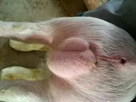 猪的阴囊疝俗称漏肠,是小猪的一种先天性的症状。是由于小肠直接穿通腹壁与睾丸混在一起。有的时候阉割不当如硬拉睾丸也会造成漏肠。