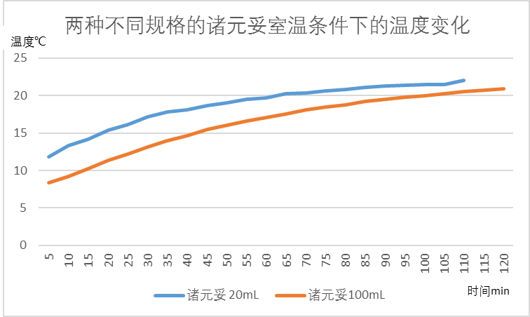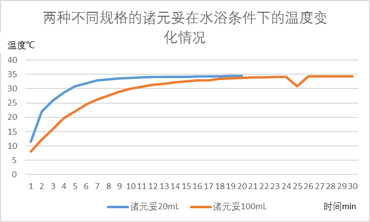 两种不同规格的诸元妥在水浴条件下的温度变化情况