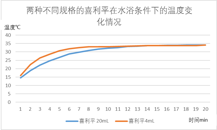 两种不同规格的喜利平在水浴条件下的温度变化情况