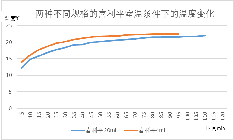 两种不同规格的喜利平在室温条件下的温度变化情况