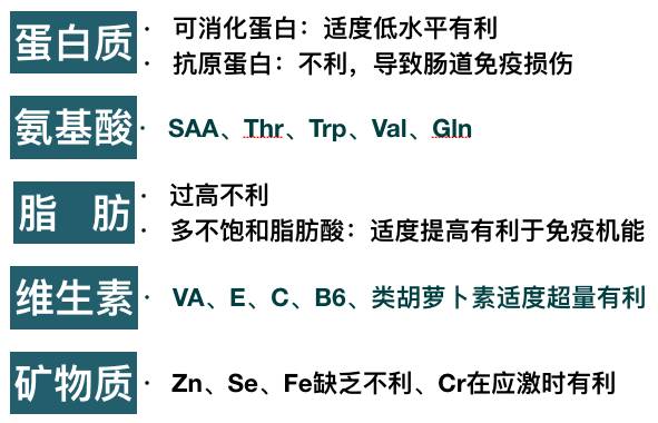 >>> 营养与免疫 <<< 免疫反应是动物抗病的根本机制,营养可以影响猪免疫系统发育和免疫功能,合理的营养方案可以增强猪的免疫力和对一并的一般抵抗力。 2.1 营养对免疫机能的影响 营养水平影响免疫系统的发育及免疫力水平。 任何养分的严重缺乏,长期整体营养不良均损伤免疫系统的发育和免疫力。 对大部分养分,保证最佳免疫力的需要量高于生产性能的需要量. 养分种类不同对免疫机能的影响模式不同。 2.2 影响免疫反应的主要养分 3. >>> 营养与肠道健康 <<< 胃肠道是猪健康的第一道门户,营养源和营养水平影响猪胃肠道发育、功能和微生态环境,合理的营养方案可以保障猪的胃肠道健康,提高养分消化率和对疾病的一般抵抗力。 3.1 肠道健康的重要性 有人说,养牛就是养牛胃、养猪就是养肠道、养鱼就是养水体,因为其中的微生态失衡会直接导致免疫力下降。而外界环境的变化、正常生理结构的破坏、药物、疾病、中毒、生产管理等都可以导致微生态失衡。 3.2 不同营养源对肠道健康的影响 研究发现,出生后3日龄和断奶(21日龄)后3天是仔猪肠道发育的关键转折点。 营养源不同影响肠道发育。酪蛋白优于大豆蛋白,玉米蛋白最差,添加氨基酸平衡氨基酸模式后不能完全消除这种差异;豌豆淀粉优于玉米或小麦淀粉,木薯淀粉最差;椰子油优于玉米油或鱼油,棕榈油最差。同时发现,就肠道健康而言,纯合饲粮不如自然配合饲粮。营养源差异的机制与宿主内分泌、微生物结构和代谢产物有关,营养源、宿主、微生物相互作用决定了肠道健康。 合理使用低聚糖、活菌制剂、酸化剂、酶制剂、丁酸钠、高剂量铜均可改善肠道微生态平衡,保障肠道健康,而长期或大量使用抗生素可破坏肠道微生态平衡。 >>> 营养与应激 <<< 各类应激素会影响猪的免疫力和抗病力,改变营养代谢和需要。调整营养方案可以增强猪的抗应激能力,降低发病率。 4.1 免疫应激 免疫应激状态的仔猪,采食量急剧下降,通过抑制胰高血糖素样肽-2分泌而影响仔猪肠道形态学和肠粘膜乳糖酶、蔗糖酶及碱性磷酸酶的活性。应激初期饲粮整体蛋白质需要量降低,理想氨基酸模式发生改变,苏氨酸和色氨酸与赖氨酸之比大大提高,应激后期的恢复期,蛋白质和赖氨酸需要量增加。 4.2 氧化应激 在氧化应激状况下,仔猪硒的代谢和需要量发生变化,0.2mg/kg的硒添加量不能满足机体抗氧化的需要。在应激条件下,提高精氨酸或色氨酸添加量可以缓解氧化应激。 5. >>> 营养与霉菌毒素 <<< 饲料霉菌毒素污染率很高,霉菌毒素不但影响猪的采食量和生产性能,而且破坏机体免疫力,降低疫苗的保护率,增加对疾病的易感性。调整营养方案可以缓解霉菌毒素的危害。 5.1 霉菌毒素危害 研究发现,自然霉变饲粮导致仔猪采食量下降,肝脏和肠道粘膜氧化损伤,改变空肠形态结构和养分转运载体基因表达量,降低养分消化率和转运能力,改变肠道微生物平衡,进而抑制仔猪生长。 体内外试验揭示,硒和VE能够缓解霉菌毒素对仔猪肠细胞的氧化损伤,降低霉菌毒素的危害。 5.2 营养防霉抗霉机制 小结 抗病营养的研究与应用符合养猪业可持续发展的高效、安全、优质和环保的要求,具有广阔的应用前景,也是养猪从业者未来努力的方向。 陈代文