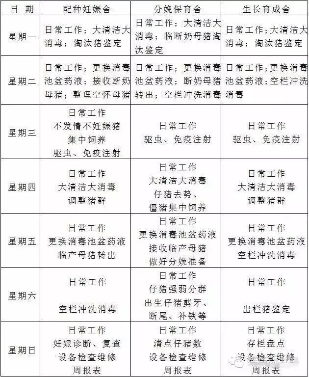 由于集约化和工厂化的现代猪场,其周期性和规律性相当强,生产过程环环相联;因此,要求全场员工对自已所做的工作内容和特点要非常清晰明了,做到每日工作事事清。