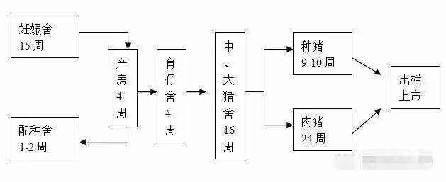 本方案针对年产10000头肉猪生产线,实行工厂化生产管理方式,采用先进饲养工艺和技术。其中肉猪生产程序是以“周”为计算单位,工厂化流水生产作业程序性生产方式,全过程分为四个生产环节,按下列工艺流程图示进行。