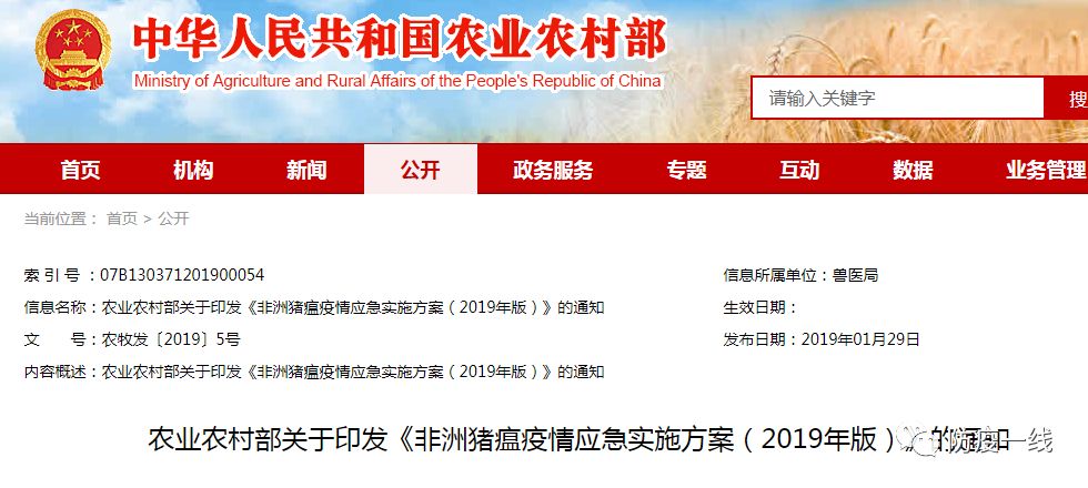 各省、自治区、直辖市及计划单列市畜牧兽医(农业农村、农牧)厅(局、委、办),新疆生产建设兵团畜牧兽医局,部属有关事业单位: 为进一步做好非洲猪瘟疫情应急处置工作,我部根据《中华人民共和国动物防疫法》《重大动物疫情应急条例》《国家突发重大动物疫情应急预案》等有关法律法规规定,组织制定了《非洲猪瘟疫情应急实施方案(2019年版)》。现印发给你们,请遵照执行。 《农业部关于印发〈非洲猪瘟防治技术规范(试行)〉的通知》(农医发〔2015〕31号)和《农业部关于印发〈非洲猪瘟疫情应急预案〉的通知》(农医发〔2017〕28号)同时废止。 农业农村部 2019年1月24日