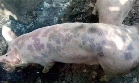夏季多见,地区性流行。病猪体温41℃-42℃,早期症状和附红细胞体相似,中期病猪,耳朵,背部,两侧,臀部发紫与健康皮肤界限明显。后期出现喘气,拉黑色干便,也可见到拉稀。剖检可见胸腔积液,肺间质增宽,回盲口弥漫性出血(可以和猪瘟相区别)。
