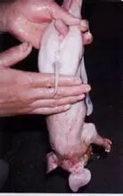 三、仔猪四肢朝上,一手托肩背部,一手托臀部,两手配合一屈一伸猪体,反复进行,直到仔猪叫出声为止。