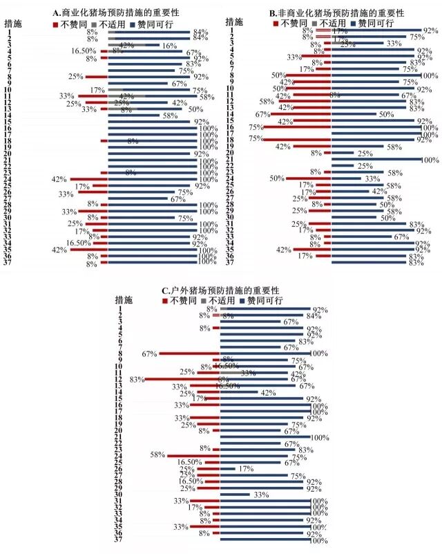 图1 预防措施的评估结果(A)商业化猪场(B)非商业化猪场(C)户外猪场