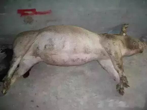 病猪往往无发病征兆,腹围迅速膨大,有腹痛表现,呼吸急促,卧地不起,伴有体温升高症状。有些猪发病在晚上也正常吃料,早晨死亡身体僵硬,腹胀隆起,口鼻流出白沫。