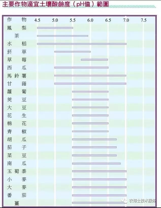 栽培农作物时,首先要弄清所栽培的作物pH适宜范围,是喜欢酸性土或中性土还是可以适宜于碱性土。 若土壤酸碱度不合适,就需要进行调节改良。