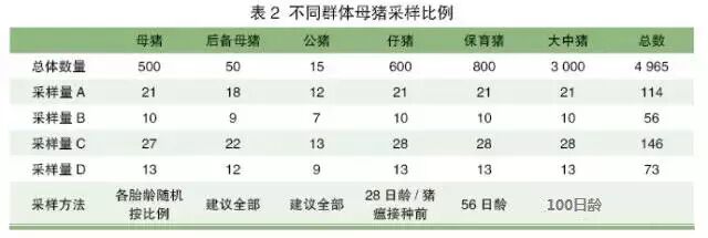 根据我国目前实际情况和现有生产水平,假如一个500 头生产母猪场,年产肉猪10 000 头,生产线实行工厂化生产管理方式,平均每头母猪年生产2.2窝。分别以置信区间为0.9 和0.95,估测阳性动物数为10% 和20% 为例,在一个时期,按照上面的公式,不同群体需要的具体采样数量如下:根据猪场实际情况做出科学的选择,一般来说,目前比较稳定的猪场,建议采用“采样量A”的采样方式;目前不稳定的猪场采用“采样量D”的方式,后备种猪建议进入生产群前,全部检测。多数情况下,根据以往的实践和统计学经验,1 000 个以上的样本中,随机20 个以上的样本被认为是合理的(介于29 和19 份之间),在检测10% ~ 15% 的样本流行疾病时获得95%的可信度。