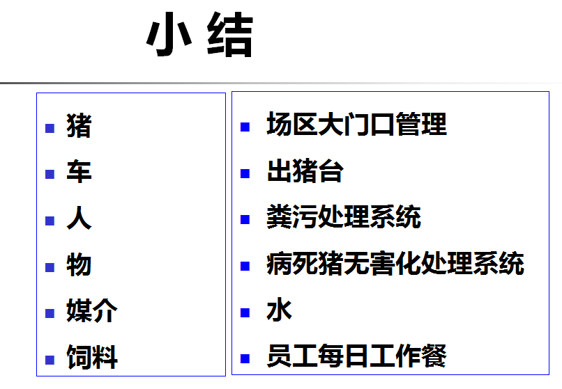 首先,建立生物安全体系。包括外部生物安全,如场址、猪群、车辆、人员、物品、其他动物等因素;内部生物安全,有免疫程序、预防程序、清洁程序、消毒程序、监控程序等。除此之外,制定完善的制度、SOP流程等,这里也特别强调一定要注重细节与执行力!