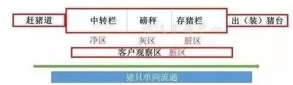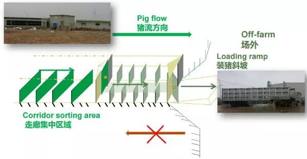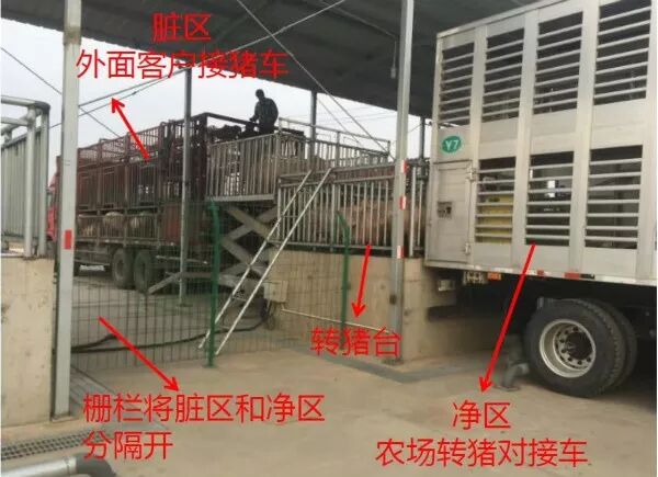 设计出猪台要考虑实用性、科学性和防疫风险。实用性是指考虑设计有可调节高度的装猪设施,方便装猪。科学性和防疫风险,体现在对外界和猪车消毒便利,要划分明确出猪台的净区和脏区,猪只只能按照净区至脏区的原则单向流动,特别注意的是外界污水不能倒流回到场内,外界人员也不能进入出猪台,场内人员不能接触外界装猪车,上车的猪只也不能返场。一旦场内工作人员接触到脏区,必须重新更衣换鞋、消毒隔离后第二天才能回到生产区工作。