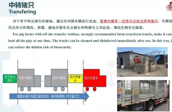 出猪台是猪场与外界车辆直接接触的,如果外面售猪车辆清洗不干净,而员工装猪时,又没有严格遵循严格的脏区和净区分隔原则,直接将场内的猪赶到接猪的车上,就很容易将清洗消毒得不干净的车上的病毒(包括ASFv、FMDv、PEDv等)带入生产区,从而猪场染上新的疫病,这也是目前猪场最容易出现问题的环节。据笔者了解,ASFv通过离猪场很近的装猪台感染机率有85 %的机会。