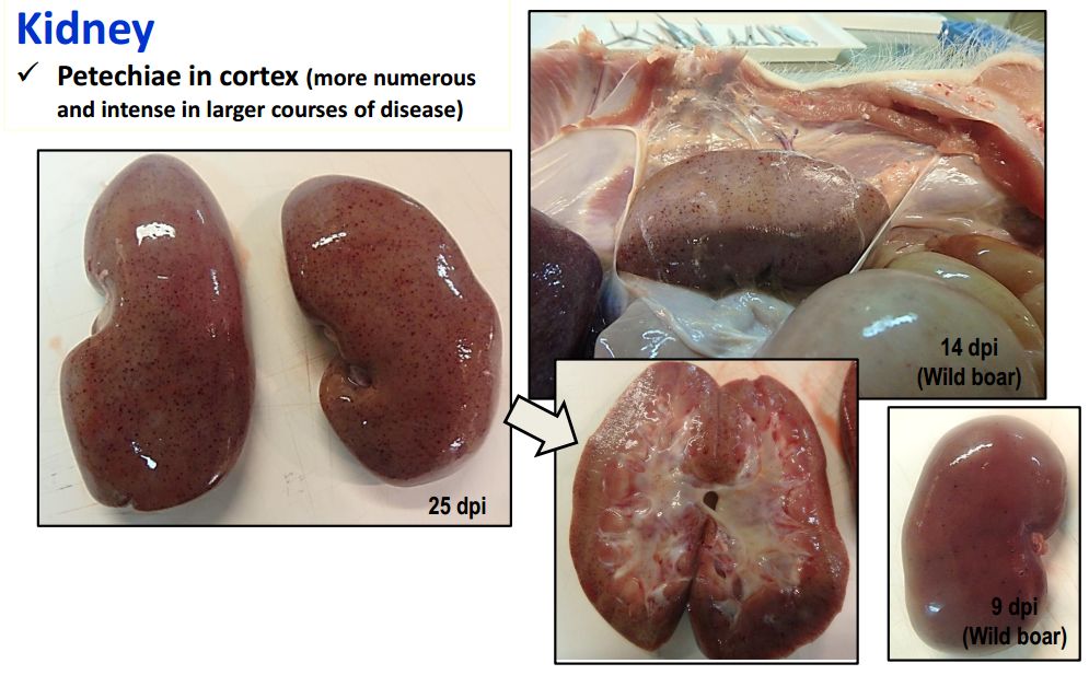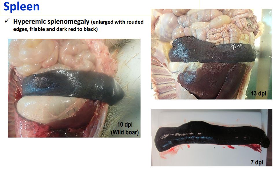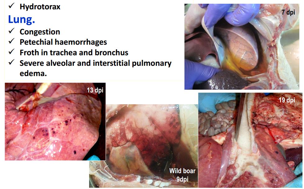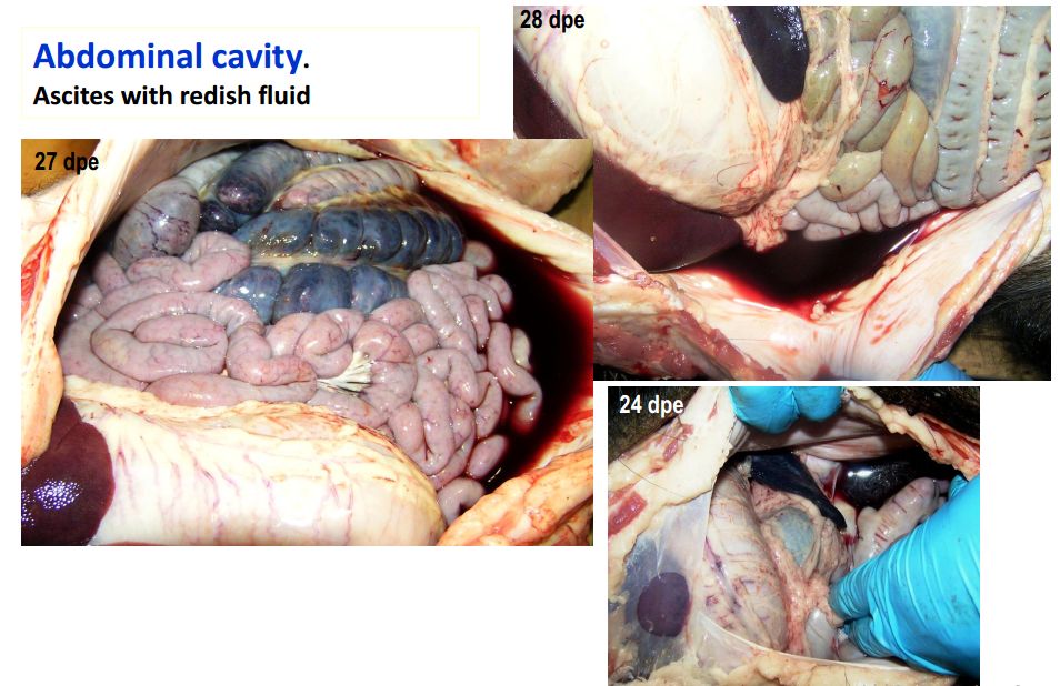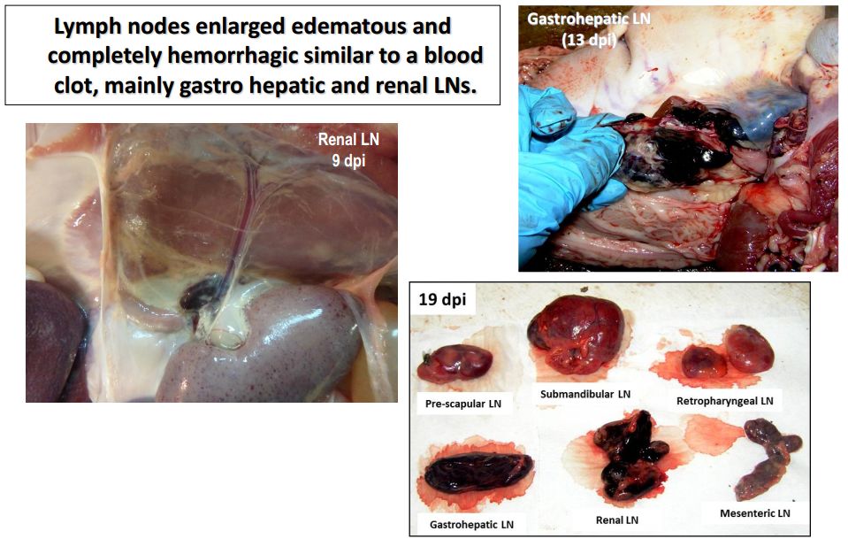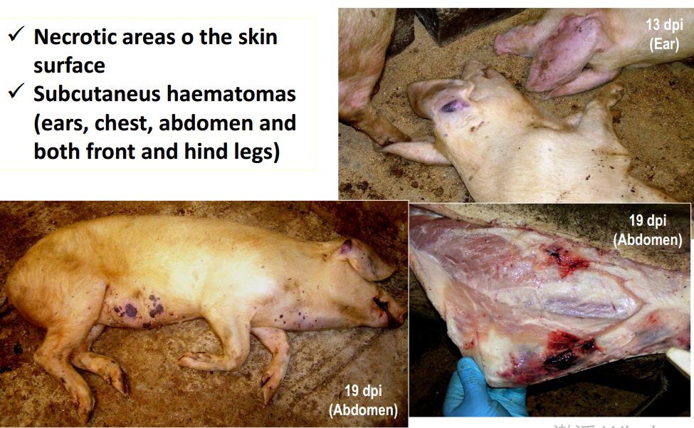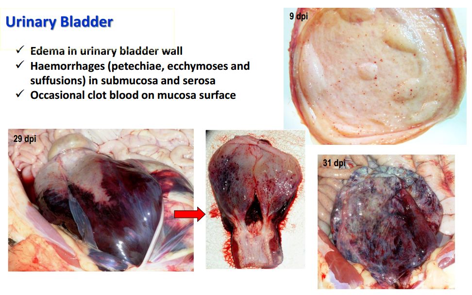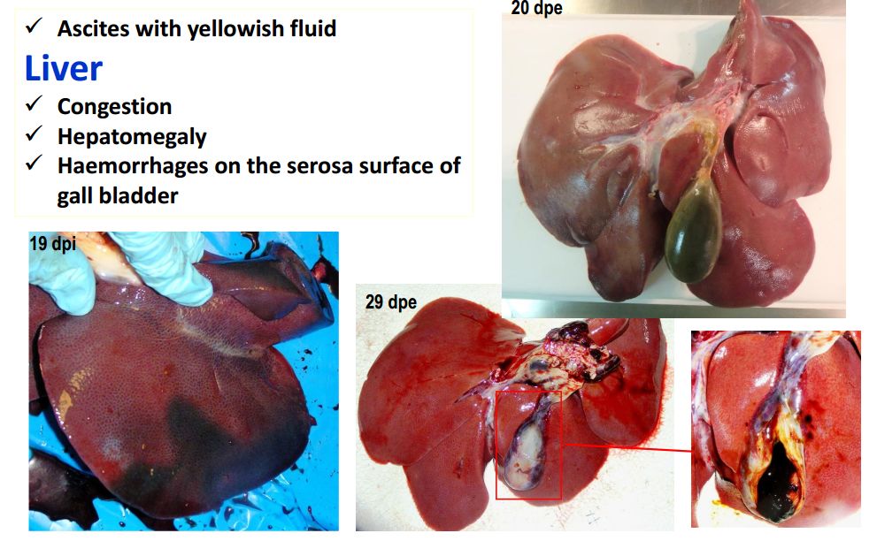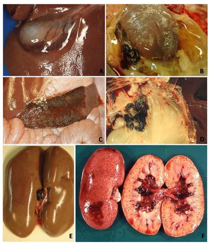 猪群发烧,聚堆,皮肤发红 耳尖前后肢皮肤发红,呈现紫绀 皮肤表面坏死,耳、胸、腹、前、后腿皮下血肿 皮肤表面坏死,耳、胸和腹部皮下血肿 排黑粪、鼻出血、口鼻泡沫 急性ASF: 表现严重的肺水肿,同时为充血性脾肿大,可能达正常的六倍,边缘为原型,同时易碎,呈现为黑紫色(图41A);淋巴结,主要是胃肝和肾淋巴结上面有出血(图41C),呈现大理石花斑(图41C);肾脏皮质和肾盂中通常出现出血瘀点(图41D)。其他非典型病理变化还包括膀胱、心内膜、心外膜和胸膜有出血瘀点。 图41急性非洲猪瘟的病理变化:A脾脏增大发紫(充血性脾肿大);B:淋巴结出血髓质中最明显;C:切开的淋巴结呈现大理石状;D:肾皮质出血。(Sanchez-Vizcaıno et al 2015) 亚急性ASF: 猪只呈现腹水、心包积液和胆囊和胆管壁的特征性水肿(图42A),以及肾周水肿(图42B)。脾脏初始表现为部分充血性脾肿大(图42C),逐渐转归,留下一些病灶损害,最终消失。淋巴结,主要是胃肝(图42D)和肾淋巴结(图42E),以及颌下腺、咽后、纵隔、肠系膜和腹股沟淋巴结出血、水肿和易碎,表现为深红色血肿(Sanchez-Vizcaınoand Arias, 2012; Gomez-Villamandos et al., 2013)。肾出血(图42F)比急性ASF形式更强烈(瘀点和瘀斑)和更广泛的(皮质、髓质和骨盆)(Gomez-Villamandoset al., 1995a; Hervas et al., 1996)。 图42.亚急性猪瘟的病理变化:胆囊壁(A)和肾周围的显著的水肿(B);C:脾肿大;胃肝(D)和肾淋巴结(E)出血水肿;F:肾、皮质、髓质和肾盂有大量出血。(Sanchez-Vizcaıno et al 2015) 腹腔,腹水伴随红色液体 心脏,血红色心包积液,心外膜瘀血 肺脏,堵塞、瘀点出血、气管支气管内的泡沫、严重肺泡和间质性肺水肿 肝,黄色积液、堵塞、肝肿大、胆囊浆膜表面出血 胃,浆膜和粘膜瘀点出血;小肠和大肠,浆膜和粘膜瘀点出血 肾,皮质瘀斑 脾,脾肿大,易碎,暗红色至黑色的,边缘为圆形 淋巴结,主要是胃肝和肾淋巴结,以及颌下腺、咽后、纵隔、肠系膜和腹股沟淋巴结出血、水肿和易碎,表现为深红色血肿 膀胱,膀胱壁水肿、粘膜下层和浆膜下出血(瘀斑、瘀血和瘀血)、粘膜表面偶发凝块血 中度到重度关节肿胀,常伴随皮肤变红,凸起和坏死 中毒到重度关节肿胀,常伴随皮肤变红,凸起和坏死,紫绀 严重呼吸系统疾病、干酪样坏死与肺的矿化