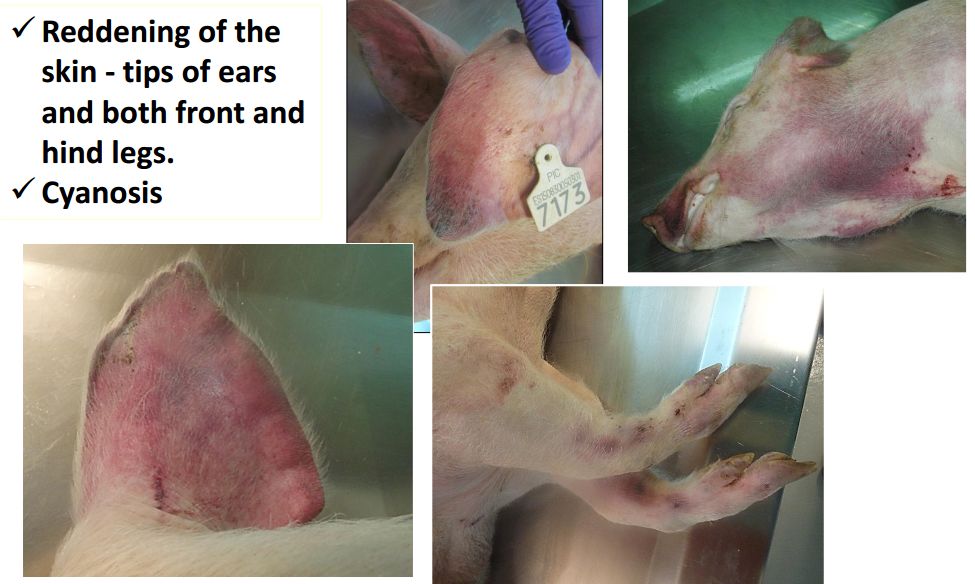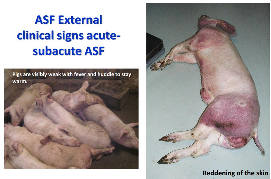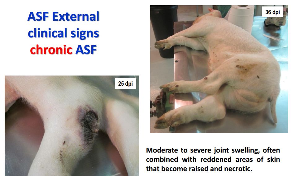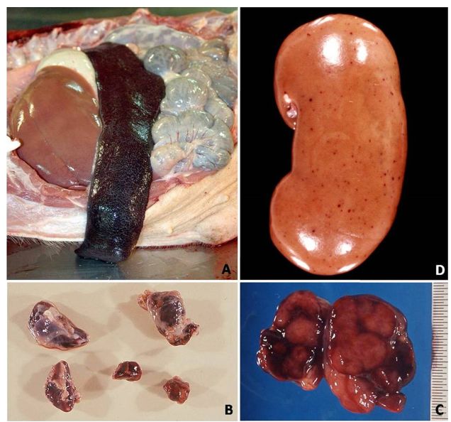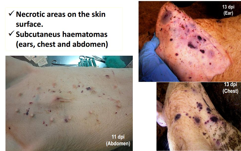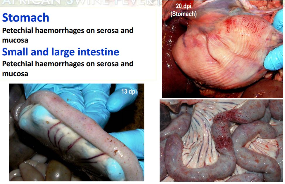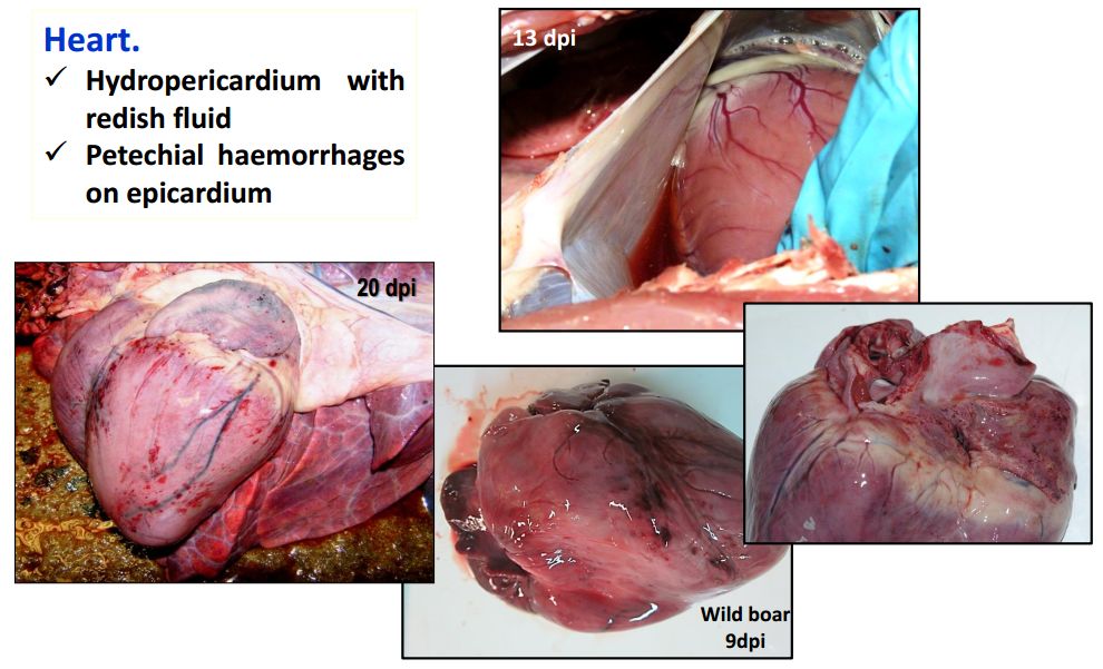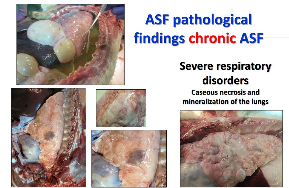 猪群发烧,聚堆,皮肤发红 耳尖前后肢皮肤发红,呈现紫绀 皮肤表面坏死,耳、胸、腹、前、后腿皮下血肿 皮肤表面坏死,耳、胸和腹部皮下血肿 排黑粪、鼻出血、口鼻泡沫 急性ASF: 表现严重的肺水肿,同时为充血性脾肿大,可能达正常的六倍,边缘为原型,同时易碎,呈现为黑紫色(图41A);淋巴结,主要是胃肝和肾淋巴结上面有出血(图41C),呈现大理石花斑(图41C);肾脏皮质和肾盂中通常出现出血瘀点(图41D)。其他非典型病理变化还包括膀胱、心内膜、心外膜和胸膜有出血瘀点。 图41急性非洲猪瘟的病理变化:A脾脏增大发紫(充血性脾肿大);B:淋巴结出血髓质中最明显;C:切开的淋巴结呈现大理石状;D:肾皮质出血。(Sanchez-Vizcaıno et al 2015) 亚急性ASF: 猪只呈现腹水、心包积液和胆囊和胆管壁的特征性水肿(图42A),以及肾周水肿(图42B)。脾脏初始表现为部分充血性脾肿大(图42C),逐渐转归,留下一些病灶损害,最终消失。淋巴结,主要是胃肝(图42D)和肾淋巴结(图42E),以及颌下腺、咽后、纵隔、肠系膜和腹股沟淋巴结出血、水肿和易碎,表现为深红色血肿(Sanchez-Vizcaınoand Arias, 2012; Gomez-Villamandos et al., 2013)。肾出血(图42F)比急性ASF形式更强烈(瘀点和瘀斑)和更广泛的(皮质、髓质和骨盆)(Gomez-Villamandoset al., 1995a; Hervas et al., 1996)。 图42.亚急性猪瘟的病理变化:胆囊壁(A)和肾周围的显著的水肿(B);C:脾肿大;胃肝(D)和肾淋巴结(E)出血水肿;F:肾、皮质、髓质和肾盂有大量出血。(Sanchez-Vizcaıno et al 2015) 腹腔,腹水伴随红色液体 心脏,血红色心包积液,心外膜瘀血 肺脏,堵塞、瘀点出血、气管支气管内的泡沫、严重肺泡和间质性肺水肿 肝,黄色积液、堵塞、肝肿大、胆囊浆膜表面出血 胃,浆膜和粘膜瘀点出血;小肠和大肠,浆膜和粘膜瘀点出血 肾,皮质瘀斑 脾,脾肿大,易碎,暗红色至黑色的,边缘为圆形 淋巴结,主要是胃肝和肾淋巴结,以及颌下腺、咽后、纵隔、肠系膜和腹股沟淋巴结出血、水肿和易碎,表现为深红色血肿 膀胱,膀胱壁水肿、粘膜下层和浆膜下出血(瘀斑、瘀血和瘀血)、粘膜表面偶发凝块血 中度到重度关节肿胀,常伴随皮肤变红,凸起和坏死 中毒到重度关节肿胀,常伴随皮肤变红,凸起和坏死,紫绀 严重呼吸系统疾病、干酪样坏死与肺的矿化